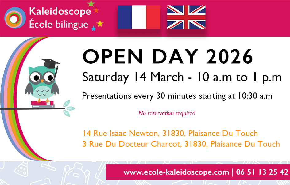 Kaleidoscope École Bilingue is a bilingual French-English preschool and primary school that welcomes from the Petite Section (age 3) to the CM2 (aged 11).